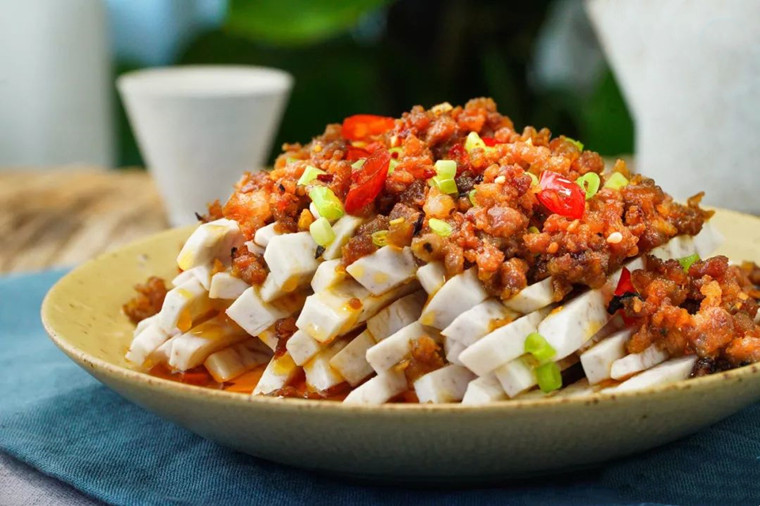 然后放入少许盐、蚝油翻炒均匀,将肉末浇在芋头上。冷水入锅蒸20分钟,至芋头熟透。