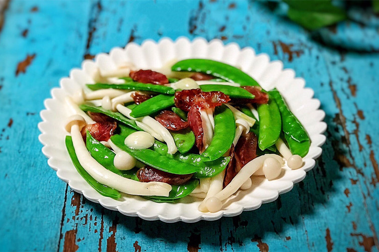 荷兰豆去掉老筋,处理好后抓洗两遍。海鲜菇去掉根部,清洗干净,切成小段。腊肠切成薄片。大蒜切片。