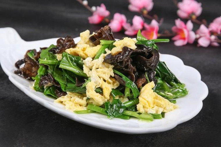 另起锅加油,烧热后倒入蛋液,炒成小块,再倒入菠菜,木耳翻炒均匀。