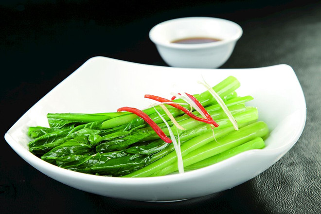 3、取出菜心,撒上盐,淋上一些生抽、香油即可。
