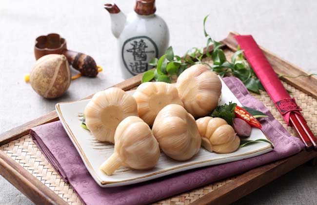 【方法】①选用整齐、肥大、皮色洁白、新鲜的蒜头。去掉须根,剥去老蒜皮,洗净沥干水分。②按每100千克鲜蒜头用盐10千克的比例,在缸内一层层装好,装到大半缸即可,另外用同样大小的缸一口,备用。③每天早晚各换缸一次,这样,蒜头腌制均匀,腌至15天后,即成咸蒜头。④捞出蒜头,在席上晾晒,每天翻动一次,晒至原重的70%为宜。发现蒜皮松弛者即需剥去。⑤将咸蒜头装坛,轻轻压紧,待装到坛子3/4时,将配制好的糖醋液注入坛内。装满后在坛中横放几根竹片,以免蒜头上浮。用油纸或塑料布将坛口扎紧,用三合土封好,2个月后即可食用。如密封贮藏,可以长期保存。⑥糖醋液配制:先将食醋加热到80℃,再加红糖使其溶解,酌加五香粉少许。