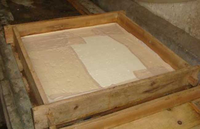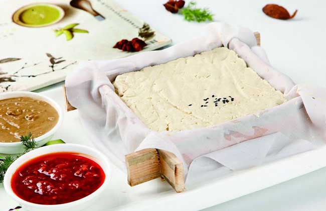 【做法】①将选好的花生仁放入温水中浸泡一夜,隔天捞出,去掉红皮,加入适量的水,用机器粉碎磨浆,用细纱布过滤2~3次,去掉残渣。②加入调料和适量食盐,同浆液一起搅成糊状,倒入铁锅,用文火边煮边搅拌,到全部变为白色、没有浆液时为止。③迅速取出倒入豆腐盘架上,遮盖好豆腐包布,压上盖板,放上15③20公斤的重物,压30分钟待冷却后即成。
